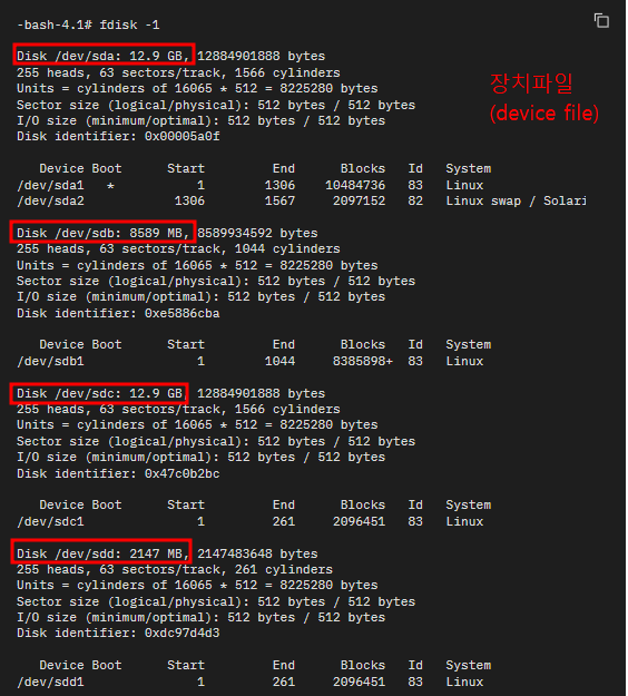 fdisk 명령어로 디스크/파티션 장치 파일 구성을 볼 수 있다.