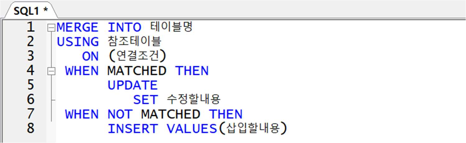- 수정할 테이블명을 MERGE INTO 절에 명시하고 참조 테이블을 USING 절에 명시